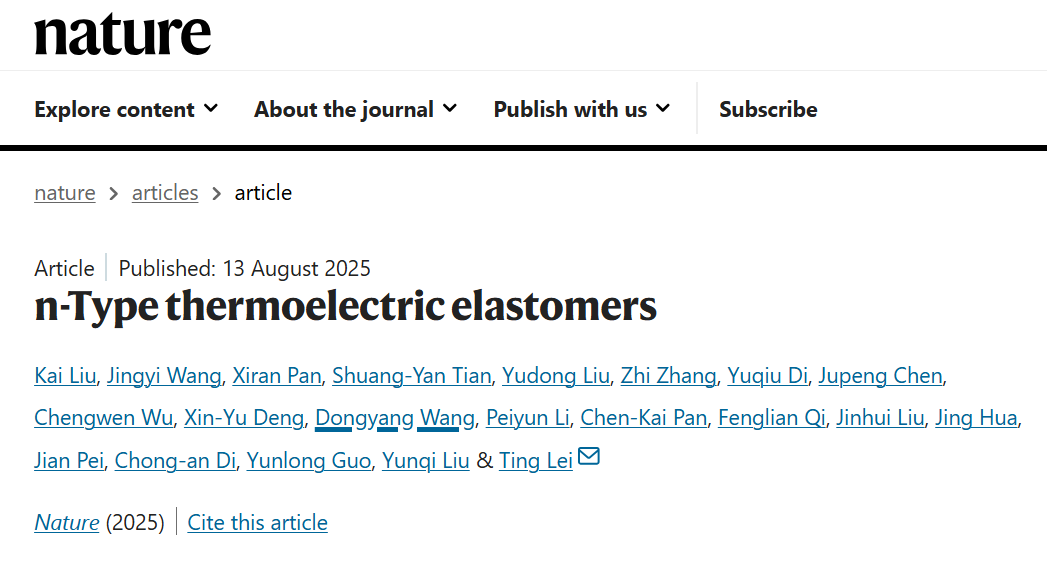 北京时间8月13日23时,国际顶级学术期刊Nature以“N-type thermoelectric elastomers(N型热电弹性体)”为题,在线发表了beat365正版唯一官网必一高分子科学与工程学院刘凯教授(第一作者)的最新研究成果,实现了学校在国际顶级学术期刊的历史性重大突破!