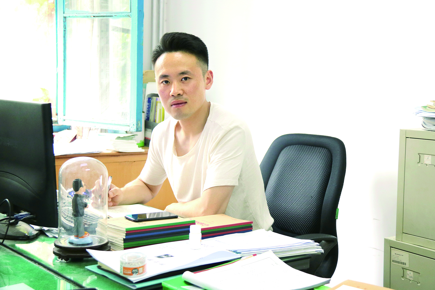 张飞:学生的事就是我的事记者 李粟门口两名排队等着交流的学生,办公桌上五六摞学生工作相关材料,电脑屏幕上开着七八个班级群聊QQ对话框。这是记者第一次进入张飞老师办公室看到的场景。当时的他,正在听身边一个同学讲自己找工作的情况,不时在一个专用的小本子上记录着。那上面,密密麻麻写着目前还没签约的几十个学生各自找工作的进展。在等待采访的间隙,环视一圈拥挤的办公室,最吸引眼球的是电脑旁摆着的一个二十厘米...