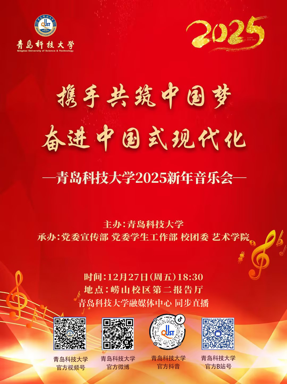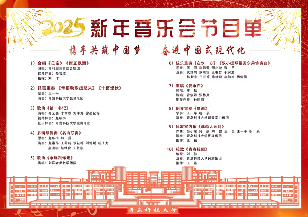 2025年新年将至,在辞旧迎新之际,学校党委宣传部、党委学生工作部、校团委、艺术学院共同承办的“携手共筑中国梦 奋进中国式现代化”beat365正版唯一官网必一2025新年音乐会将在崂山校区第二报告厅精彩上演。诚挚邀请广大师生前来欣赏,一起迎接新年的到来。