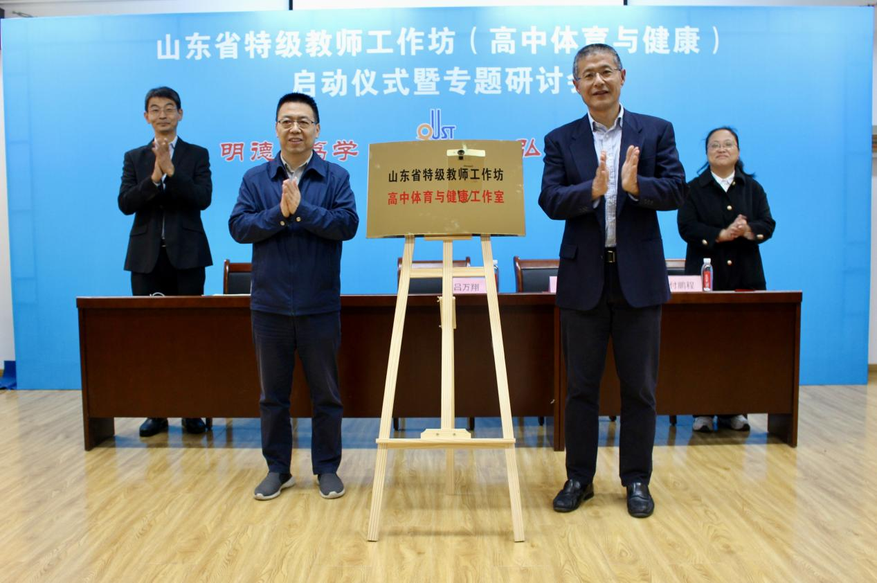 吕万翔与体育学院院长葛振营共同为山东省特级教师工作坊高中体育与健康工作室揭牌。