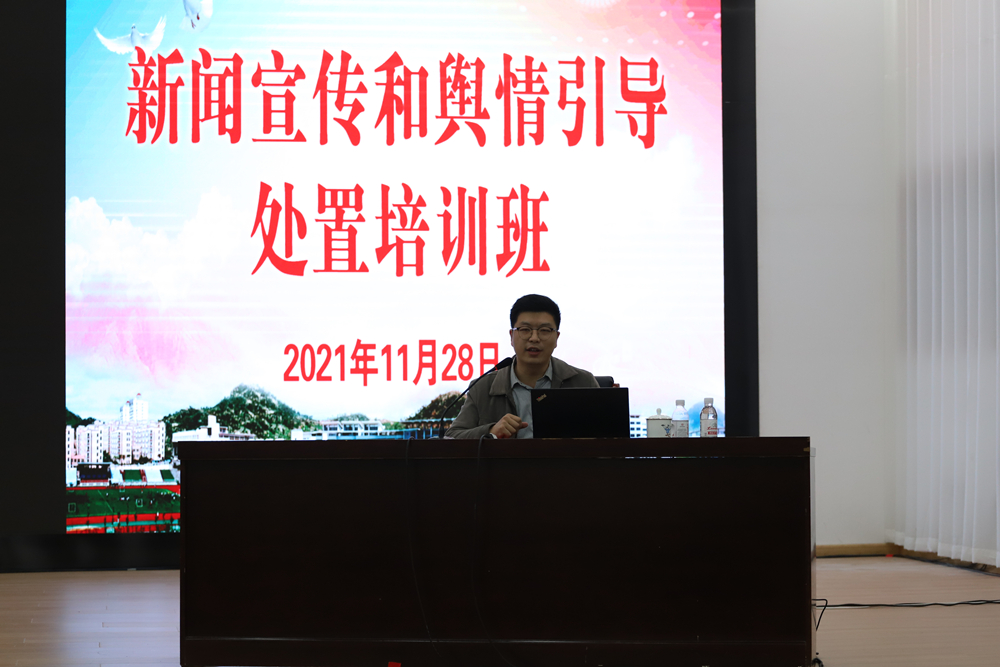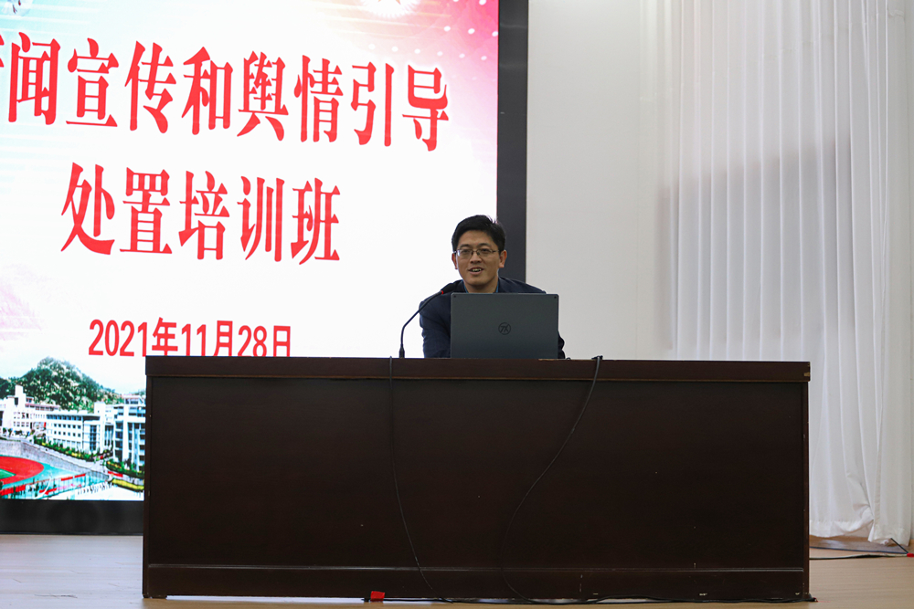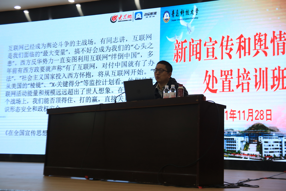 28日下午,山东省互联网集团舆情分析师、山东省教育系统核心网评员曲顺以《新媒体环境下高校舆情应对策略》为题,系统介绍了新媒体环境下高校舆情应对策略,为学校做好舆情引导与应对处置提供了有益借鉴。党委宣传部副部长兼新闻中心主任、报社社长李鲲鹏主持培训会并以《做好新时代新闻舆论工作建强新闻舆论工作队伍》为题,从习近平总书记关于新闻舆论工作的重要论述、有关工作通报、学校舆论引导应急预案及舆情处置流程、学校新闻宣传文件及要求、新闻图片拍摄及写作编审注意事项等方面作了工作报告。