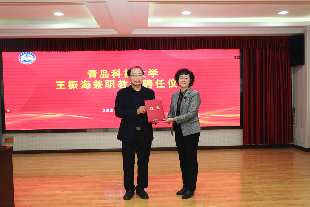 会前,张淑华为原青岛市委统战部一级巡视员王振海颁发学校兼职教授聘书。