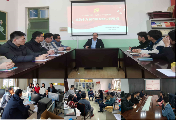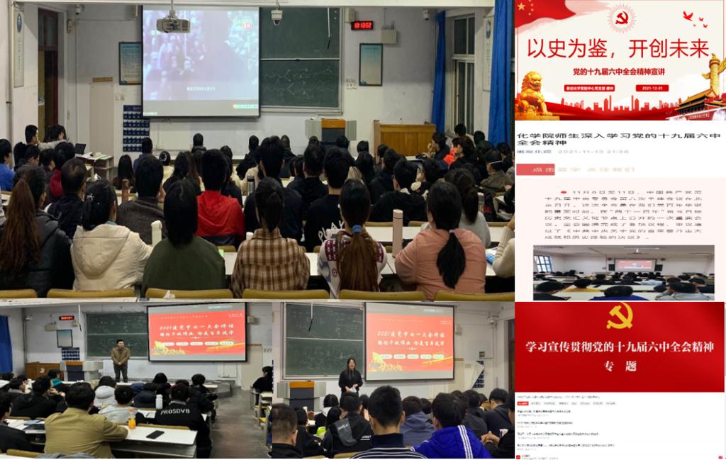 为深入贯彻学习党的十九届六中全会精神,化学院组织开展多形式、多角度学习活动,保证全会精神入脑入心、全会思想走实走深、全会理论见行见效。