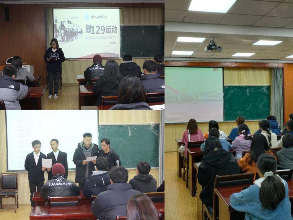 经管学院牢记“坚持政治性与学理性相统一”的要求,党团联动 、以党带团,以主题党日活动、“三会一课”等途径,以集体学习和自学相结合,围绕党支部、团支部开展活动,引导党员率先强化思想、砥砺担当,并以学院团学骨干为着手点,开展纪念“一二•九”主题学习活动,朗读红色经典,诵读青年心声,以点带面、全面辐射,强化学生理论认识和思想认知,引导学生在实际生活中传承先辈的革命精神,把所学的理论知识真正融入情感和意志。