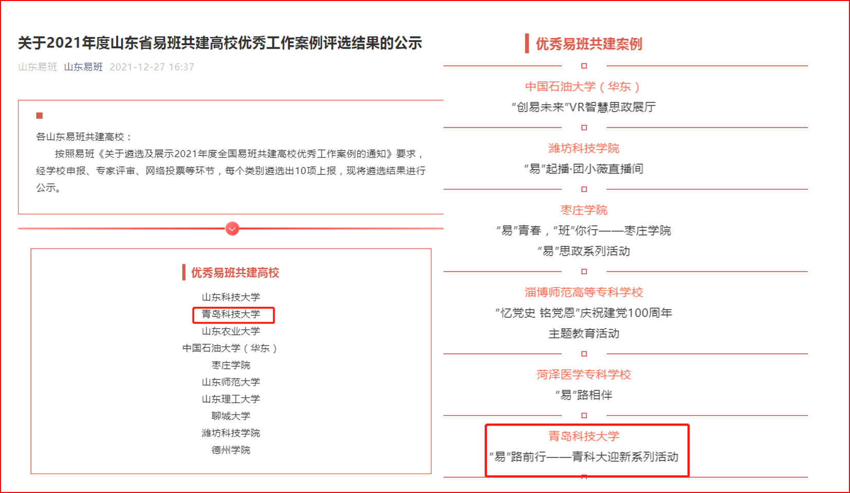12月27日,山东省易班发展中心2021年度评优工作评选结束。在山东省易班共建高校优秀工作案例评选中,学校被评为“优秀易班共建高校”,“‘易’路前行——beat365迎新系列活动”被评为“优秀易班共建案例”,校易班指导教师高洪涛被评为“优秀易班指导教师”,化工学院柳晓阳被评为“优秀易班辅导员”,校易班工作站站长李秀喜被评为“优秀易班工作站站长”。学校在全部评优工作中均获得表彰,取得了省级易班年度评优优秀成绩。