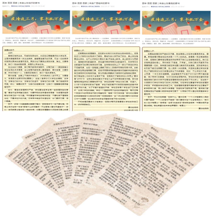 学院加强家校联动,第一时间通过官方网站、微信公众号、视频号等渠道发布实时动态,反映学生在校学习生活和志愿服务情况,让家长得以随时获取最新消息。学院鼓励学生多与父母进行沟通,分享自己的校园生活和学习情况,号召老师与家长进行电话或视频交流。学院开展“百年 百团 百家”家书接力活动,家长们纷纷通过线上书信方式表达了对学校的感谢、对老师的感恩、对孩子的鼓励。家校共育,同心战疫,携手为学生营造了健康、安全、有序的生活和学习环境。