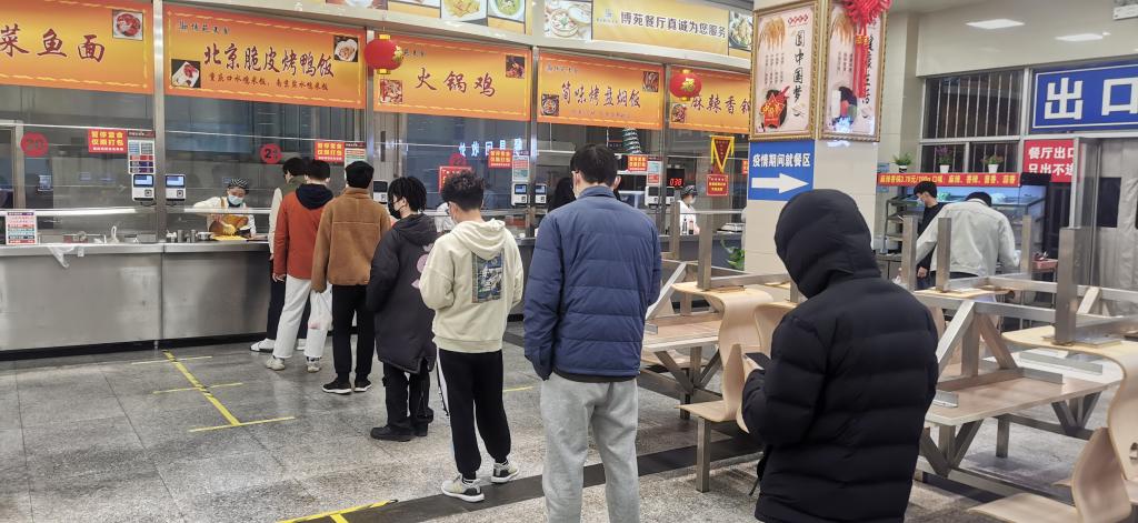 为有效落实疫情防控要求,各餐厅暂停了堂食,改为打包带走就餐模式。饮食中心留校坚守岗位的15名人员轮流值守各餐厅,做好就餐秩序的疏导,提醒就餐人员规范佩戴口罩,他们的善意提醒有时会遭到部分就餐人员的抵触和反感,但他们没有因此降低对工作的执行标准,也没有丝毫的懈怠和抱怨,始终如一的投入到疫情防控各项工作中。为减少就餐人员的聚集,各餐厅拉长了餐饮供应时间,从早6:00至晚9:00,全天15个小时提供不间断的餐饮服务。另外,为最大限度的减少饮食物资运输车辆与师生时空上的交集,对进校的饮食物资车辆进行了最大限度的整合,在满足饮食物资供应的前提下,减少进校运输车辆的数量;同时,所有进货车辆严格按照进校前充分消杀,司机不下车,不与校内人员接触的原则,进货时间调整为夜间10:30至次日早6:30之间,饮食中心每日对进校车辆和人员进行一一仔细严格审核,各餐厅在完成全天紧张的餐饮保障任务后,安排人员进行物资的搬运,他们中的一些人全天休息时间仅为三四个小时。