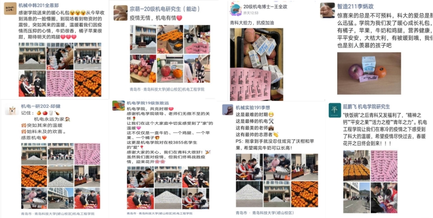 “机电永远的家!”“疫情无情,机电有情”“大爱机电!真的太贴心了!”“beat365yyds!机电yyds!”“我们就是传说中的‘别人家的大学’!”“学校和学院总会送来惊喜”“我们在这里感受到了‘家’的温暖”“前有铁饭碗,后有暖心包,没错,我们就是别人家的学校学生”“超爱青科,超爱机电”“感恩有你,让我们一起静待花开!”“学院的惊喜总是措不及防,刚听闻要发放暖心成长礼包,没想到马上就收到了”,收到这份别样的“暖心礼”后,师生们纷纷晒出了自己对学院的感谢和对战“疫”的信心。温暖的牛奶、香甜的水果、美味的鸡腿,温暖着师生的心、洋溢着浓浓的情,一时间,这份暖心刷爆朋友圈,成为beat365校园里的“网红”。学院党委副书记肖强说:“一个鸡腿,虽小但意义深远,是给抗疫路上的青年志愿者助力,也是给今年考研复试的学生加力,更是给广大机电学子强身健体的动力。”“这是一场生动的实践‘思政课’,我被学校学院的做法深深感动,触动心灵的震撼,真诚暖心的惊喜,我一定努力学习,多参加体育运动,多读有益之书”,机电工程学院青年志愿者高艺说道。