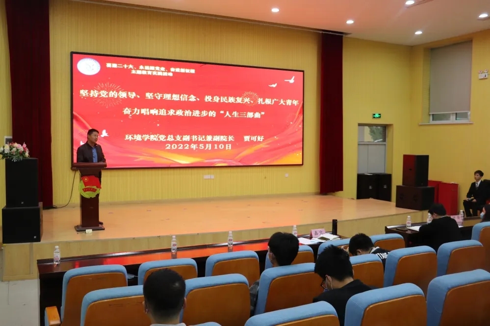 环境学院团委在讲学厅开展主题教育专题团课,党总支副书记兼副院长贾可好以“坚持党的领导、坚守理想信念、投身民族复兴、扎根广大青年,奋力唱响追求政治进步的‘人生三部曲’”为主题,为全体参会师生讲授本次团课,呼吁大家要做堪当民族重任的新青年,引发师生强烈共鸣,取得良好成效。
