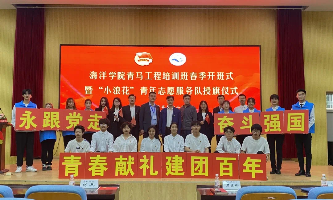 海洋学院团委举办“喜迎二十大、永远跟党走、奋进新征程”主题微团课比赛,并召开“青马工程”培训班春季开班仪式暨“小浪花”青年志愿者服务队授旗仪式。