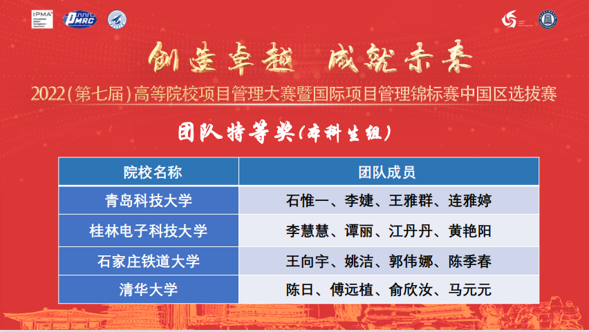 其中,由董华、黄天赐老师指导,石惟一、李婕、王雅群、闫湘琳、连雅婷同学的项目团队获特等奖,团队竞赛总成绩全国第一,并在候选代表中国参加国际项目管理锦标赛的队伍中成绩名列榜首;闫湘琳、杨亚茹、股闯、姜治恒同学的项目团队获三等奖。李婕、石惟一、王雅群个人成绩位列全国前三,取得了beat365参加历届项目管理大赛的最优成绩。