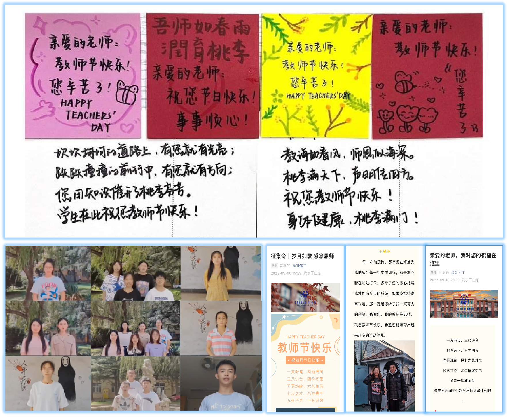 营氛围,谢师恩。学院以视频诉说师生情谊,用笔杆写下温暖祝福。学生拍摄视频表达对老师们崇高的感谢与真挚的祝福,送上贺卡感恩老师们的辛勤付出。学院还推出教师节祝福征集活动,以多样的角度记录老师朴实无华的教诲和日夜不休的陪伴,创作出一篇篇情真意切、温暖人心的作品,将老师们的辛苦付出跃然纸上,将学生们的祝福传递给老师。