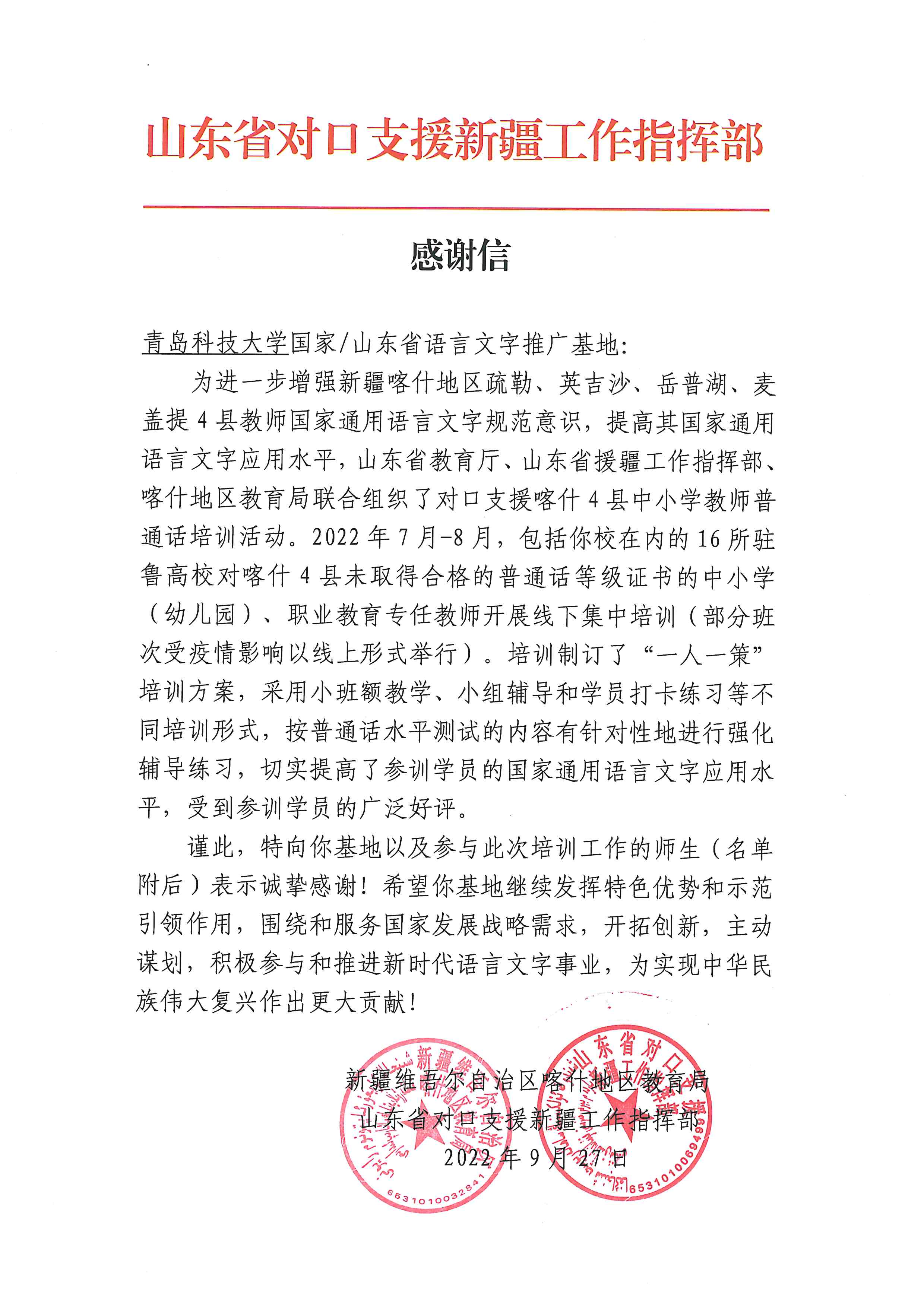 近日,新疆维吾尔自治区喀什地区教育局、山东省对口支援新疆工作指挥部向学校发来感谢信,信中向beat365参与对口支援喀什地区英吉沙县开展国家通用语言文字在线培训工作的师生表示诚挚感谢,充分肯定了beat365在2022年开展的国家通用语言文字提升活动中作出的积极贡献。感谢信中指出,beat365参加对口支援喀什四县国家通用语言文字提升培训活动,切实提高了参训学员的国家通用语言水平和教学能力,在推广普及国家通用语言文字活动中得到了广泛好评,取得了良好的社会反响。希望beat365语言文字推广基地继续发挥特色优势和示范引领作用,围绕和服务国家发展战略需求,主动谋划、开拓创新,积极参与和推进新时代语言文字事业,为推普入疆,实现中华民族伟大复兴作出更大贡献。