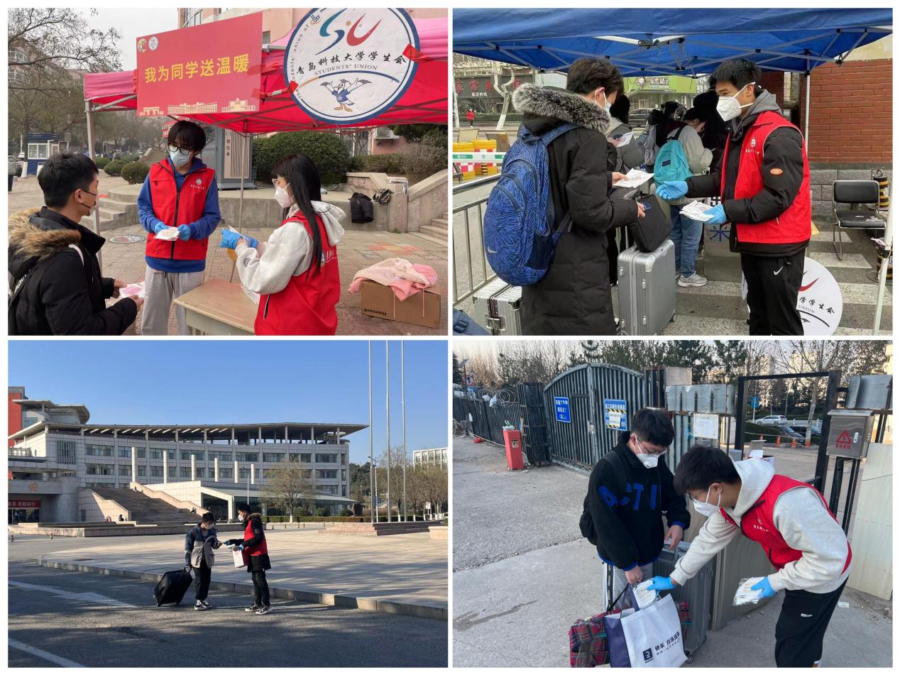 12月8日至11日,校团委、校学生会、校研究生会组织主要学生骨干连续四天在崂山、四方校区的食堂门口、学校门口等多地,为即将离校返家的同学们发放N95口罩、免洗洗手液等防疫物资,并精心设计制作温馨小贴士,为同学们送上温馨提示、暖心祝福,用行动为同学们平安离校保驾护航。截至目前,已经累计面向广大同学发放N95口罩30000余支,并为各学院(校区)团委、学生会配发51600余支口罩、1300余瓶84消毒液等“送温暖物资”。