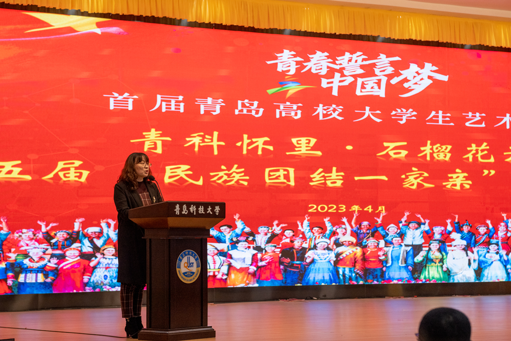 党委学生工作部部长王丽在致辞中向一直以来关心和支持学校民族团结工作的领导老师表示衷心的感谢。并对学校“青科怀里•石榴花开”少数民族学生教育品牌工作实效给予充分的肯定。她对学校各民族学生提出三点希望:一是希望同学们心连心跟党走,搭建民族团结“连心桥”,要以铸牢中华民族共同体意识为主线,树立远大的理想和抱负,团结携手、共同奋进,努力实现个人价值和民族复兴的伟大梦想。二是希望同学们手拉手向前行,凝聚民族团结“向心力”,要在互相尊重、包容、理解中建立友谊,同心同向,同力同行,争做民族团结的促进者、维护者、捍卫者。三是希望同学们肩并肩共奋斗,绘就民族团结“同心圆”,要坚持“读书学习、健康成长、创新创造、艰辛奋斗”的校园主基调,不断提高自身综合素质,为祖国和民族的繁荣昌盛做出贡献。