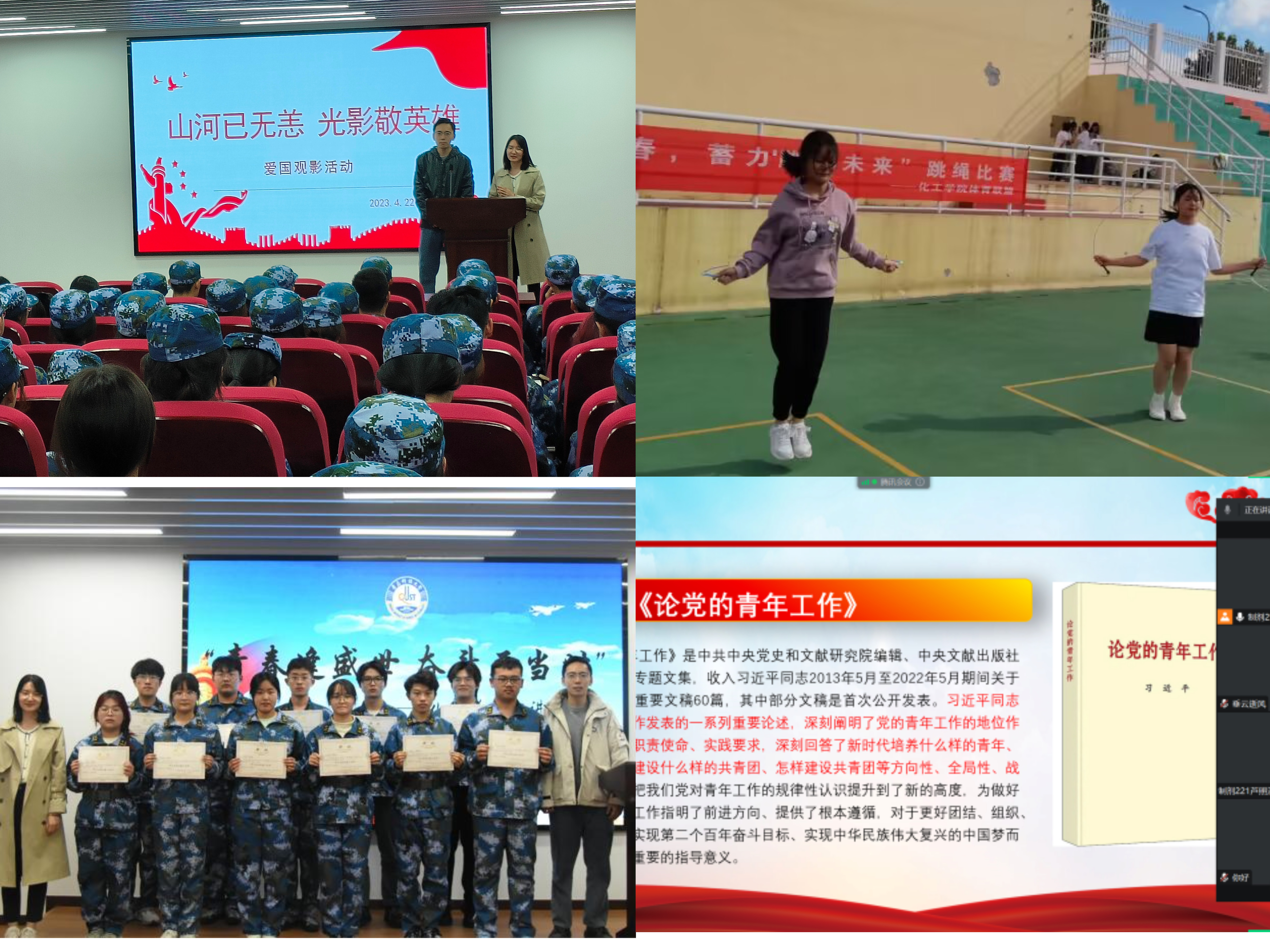 化工学院团委开展“山河已无恙·光影敬英雄”爱国观影活动,培养同学们浓烈的爱国情怀;开展“个十百千万”读书工程,号召青年学生们从吃苦中学以致用,将理论学习的“思想力”转化为担当作为的“行动力”;开展“绳舞张扬青春,蓄力‘跳’望未来”跳绳比赛,进一步激发同学们对体育运动的热爱,培养同学们自强进取的拼搏精神,展现了青年学子“积极向上,勇于进取”的良好精神风貌。