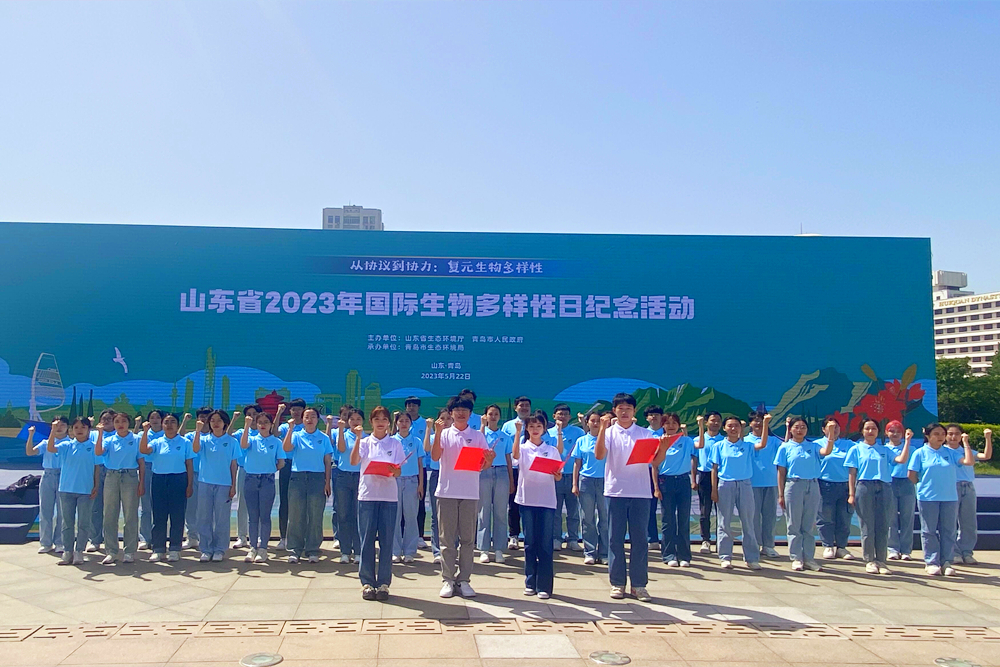 5月22日,由山东省生态环境厅、青岛市人民政府共同举办“5.22”国际生物多样性日纪念活动在汇泉广场举行,山东省生态环境厅党组书记、厅长侯翠荣,青岛市副市长于瑞波出席活动并致辞。海洋学院作为高校唯一代表参加纪念日活动,学院“小浪花”青年志愿服务队成员表演诗朗诵节目《从协议到协力,我们一起努力》。