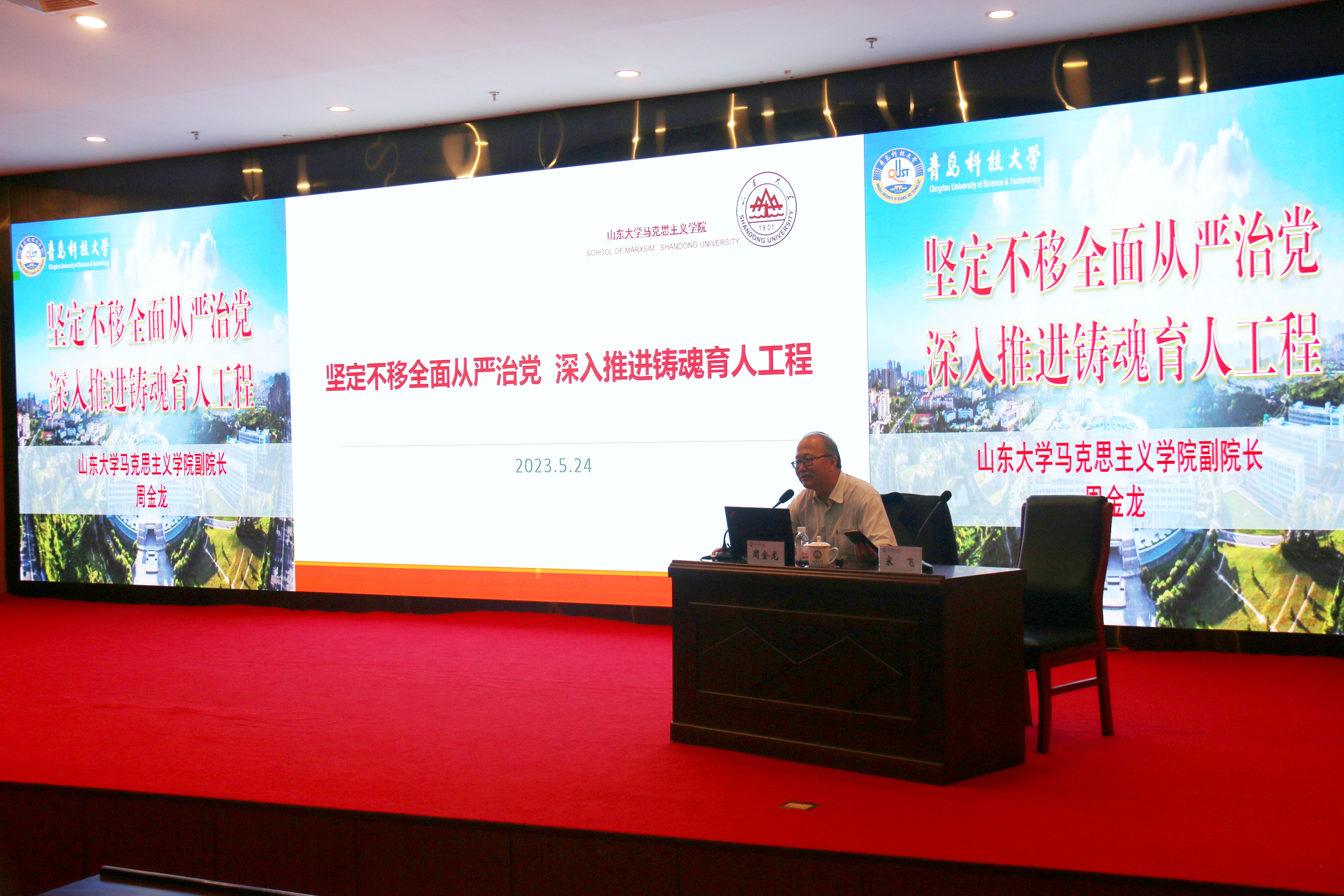 为深入开展学习贯彻习近平新时代中国特色社会主义思想主题教育,精准赋能辅导员素质能力提升,5月24日,学校在崂山校区“英科”报告厅举办“两化四有”辅导员素质能力提升培训会,邀请山东大学马克思主义学院副院长周金龙,为学校专兼职辅导员作专题报告。党委学生工作部部长王丽参加培训。