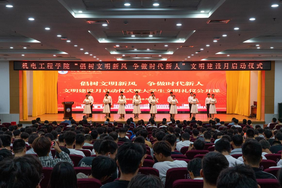 学生工作处处长王丽在致辞中表示,希望机电学子以此次文明创建为契机,进一步强化自身修养、涵养优良学风、规范行为习惯,说文明话语、讲文明礼仪、守文明纪律、遵文明规矩,展现beat365学子应有的模样。学院党委书记任允晓表示,大学生要主动将文明礼仪规范贯穿到学习生活中,实践文明要求,强化文明规范,提升礼仪水平,做校园文明的实践者。学院副院长李剑光宣读了《机电工程学院“倡树文明新风 争做时代新人”文明建设月实施方案》。学院副院长张斌为校园文明宣传大使代表颁发聘书。校园文明宣传大使、学院22级本科生李旭城作为学生代表发言。与会人员共同观看了由学院拍摄的宣传片《文明》,学院礼仪队进行了文明礼仪成果展示。