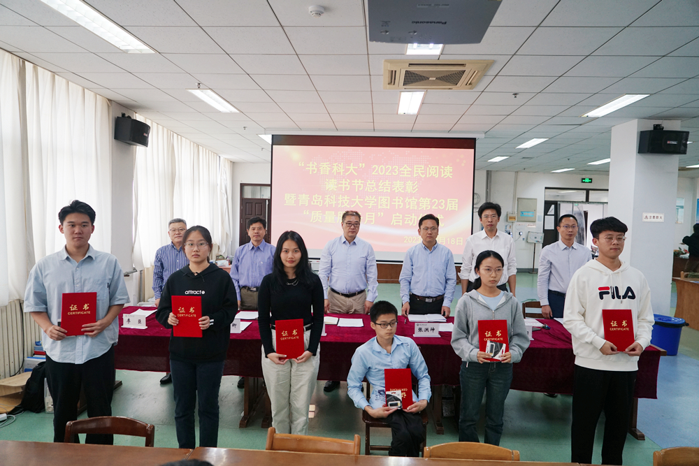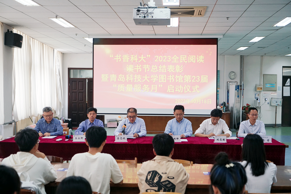 10月18日下午,“书香beat365”2023全民阅读读书节总结表彰暨beat365正版唯一官网必一图书馆第23届“质量服务月”启动仪式在崂山校区图书馆三楼期刊阅览室举行。学校党委常委、副校长李志波,党委常委、宣传部部长张洪坤出席仪式。