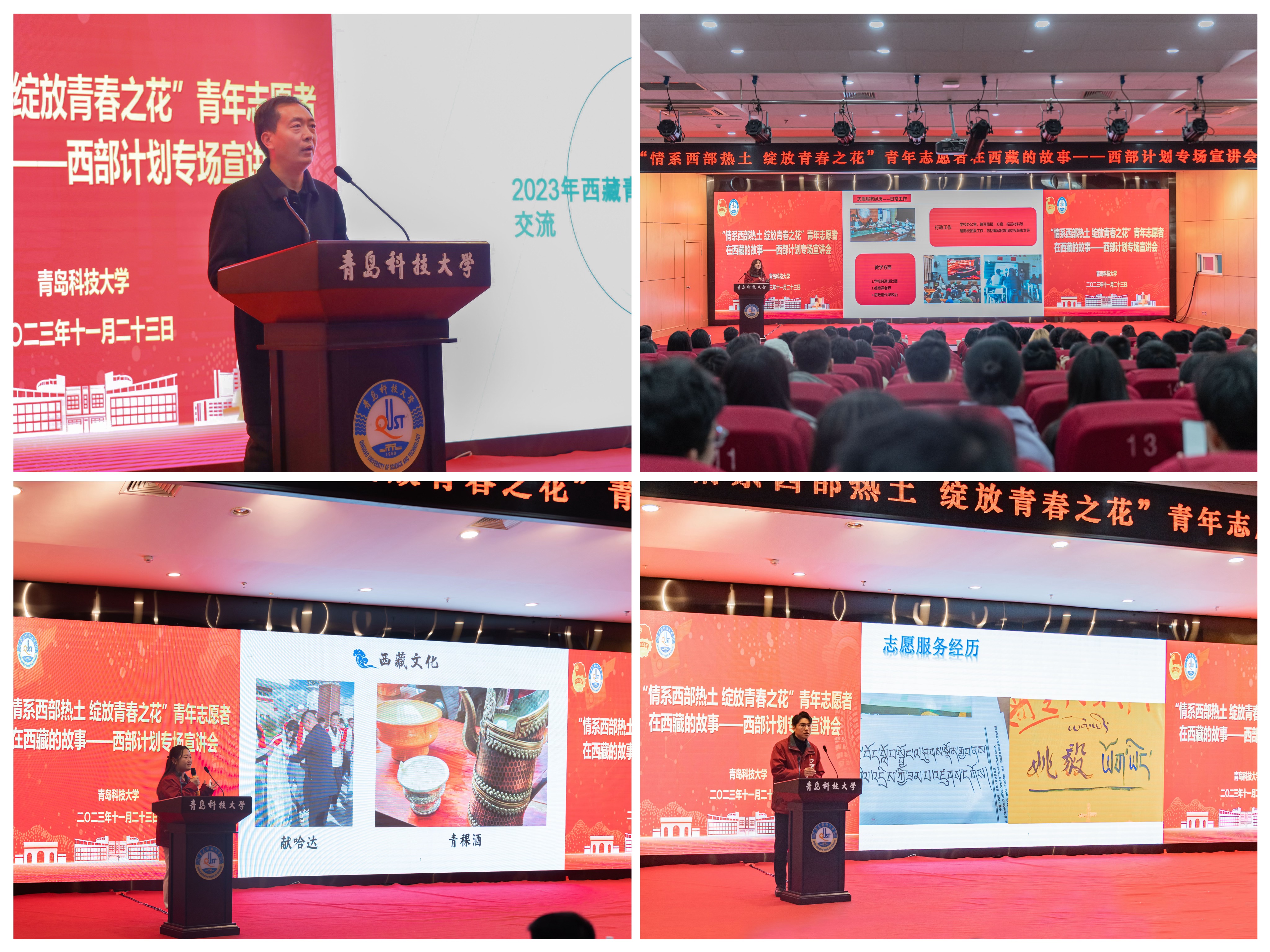 为引导和鼓励毕业生到基层和人民中去建功立业,让青春之花绽放在祖国最需要的地方,在实现中国梦的伟大实践中书写别样精彩的人生,11月23日上午,学校“情系西部热土 绽放青春之花”大学生志愿服务西部计划西藏专项宣讲会在崂山校区“英科”第三报告厅举办。共青团西藏自治区委权益志工部部长刘传磊、共青团山东省委志愿者行动指导中心武学江、学校团委书记刘跃宁出席宣讲会,校院两级团组织、学生会组织、志愿服务社团相关负责人,学校“青马工程”志雁训练营学员,2024届毕业生代表等300余人参与活动。