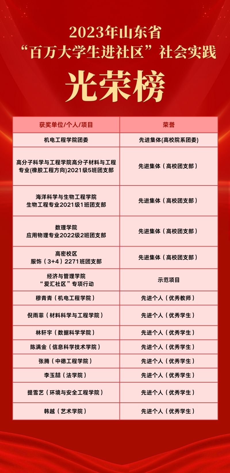 近日,共青团山东省委公布2023年度“百万大学生进社区”表扬通报名单,学校5个先进集体、1个示范项目、8名先进个人获省级“百万大学生进社区”社会实践项目表彰。