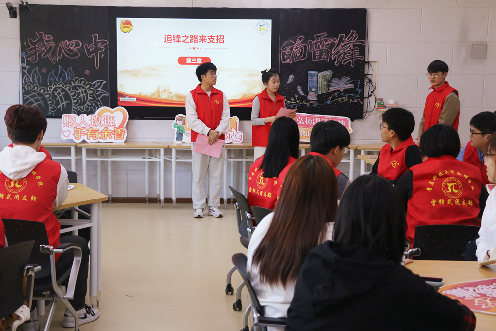 此次活动包括《听故事:重温雷锋日记》《看图片:我的雷锋时刻》《说方案:支招追锋之路》《论发展:续写雷锋故事》四个篇章。团支部成员肖家乐、苗亚文通过演绎雷锋故事、共读雷锋日记,带领大家感受雷锋力量。部分学生代表结合自身实践经历进行照片展示,通过再现图片情景、分享背后小故事等,结合平时的志愿服务内容进行分享,引导同学们从身边小事做起,服务师生、服务社区。活动现场划分4个小组展开热烈讨论,积极听取与会嘉宾和各年级团支书的意见建议,提出问题、研究方案。各小组围绕“月度主题法”为“雷锋团支部”的追“锋”之路做初步规划。