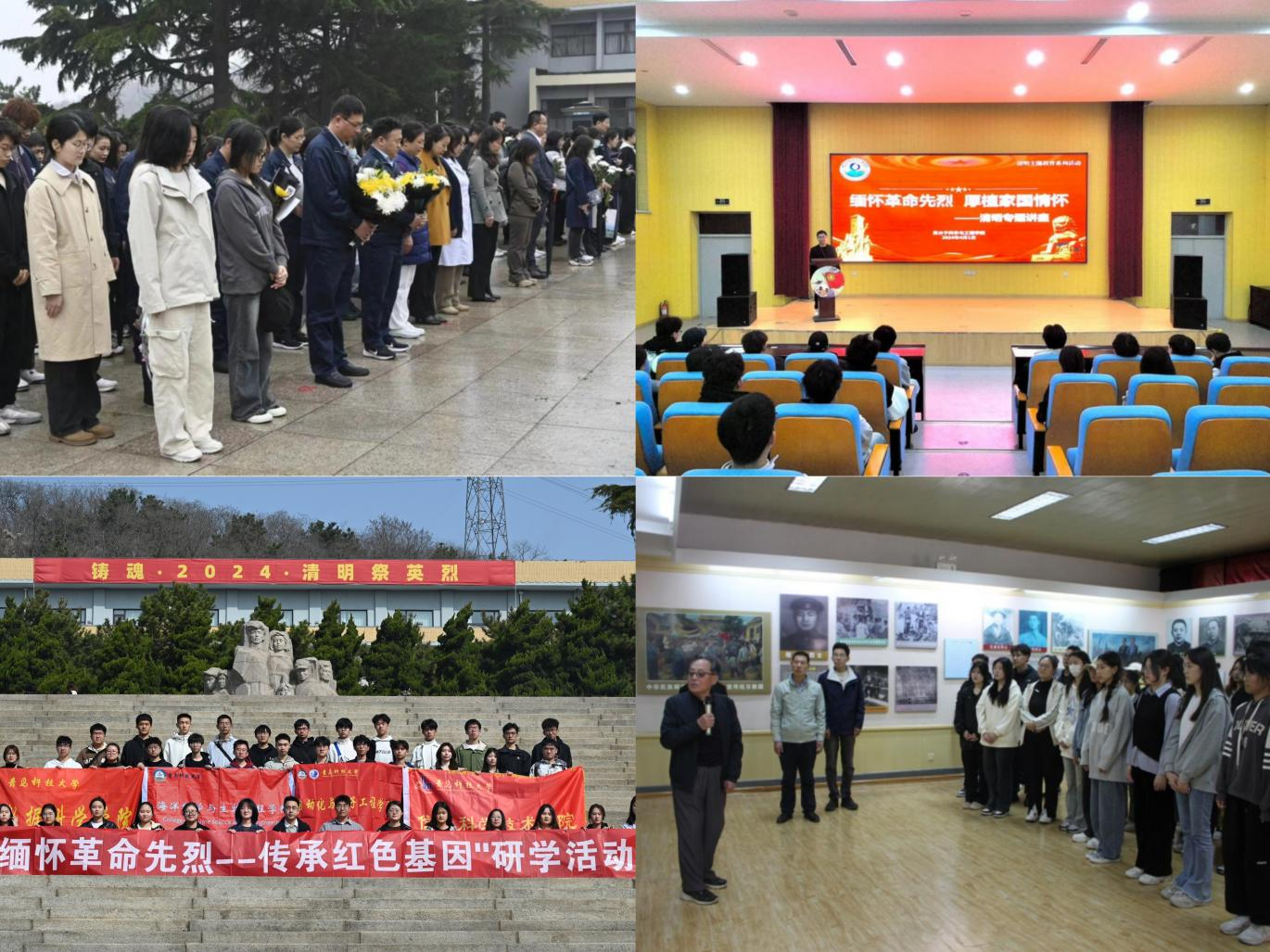 校团委、校学生会、研究生会组织青年学生前往青岛烈士陵园与革命烈士纪念馆祭扫,参观研学抗战纪念馆,向英勇牺牲的英雄烈士默哀,深刻感受到革命先烈们英勇无畏的伟大精神。化工学院团委组织各团支部依托红色观影、线上祭扫、专题学习、交流分享会等多种形式开展“缅英烈,追思扬魂”主题团课,重温红色经典,赓续红色基因,汲取前进的智慧和力量。自动化学院团委、海洋学院团委开展“缅怀革命先烈,传承红色基因”研学活动,组织学生走进青岛市革命烈士纪念馆,在仪式熏陶、沉浸式情景和实践活动中引导学生铭记革命历史,传承红色基因。中德工程学院团委组织全体学生骨干前往黄岛烈士陵园,观看英烈事迹,瞻仰英雄纪念碑,以默哀、献花表达对革命烈士的无限敬意。马克思主义学院团总支举办“铸魂·2024·清明祭英烈”线上祭扫活动,组织学生缅怀革命先烈与仁人志士,追思先烈为国为民的高尚情怀,表达对革命先烈的敬仰与追思之情。传媒学院团委组织学生观看红色电影,追忆红色历史,回顾中华民族奋斗历程,缅怀革命先烈不屈的精神,引导同学们不忘历史,坚守初心。中德科技学院团委开展“缅怀先烈,崇尚英雄”事迹分享会,组织同学们分享先烈故事,抒发学习感悟,引导青年学生铭记英雄故事,传承先烈精神。化学院团委、材料学院团委结合红色观影活动开展“缅怀英烈”清明主题演讲,在饱含真情实感的演讲中同学们纷纷抒怀心得感悟、致敬革命先辈,并通过线上线下相结合的方式以留言寄哀思,充分表达对英烈们的敬仰之情。法学院团委组织“常青藤”理论学习小组开展“传承先烈精神,奋进新时代”清明主题理论学习,讲述先烈事迹,学习英雄精神。机电工程学院团委组织开展英烈精神专题学习会,引导广大团员青年铭记历史,以尊崇之心珍视和平、以民族之力矢志复兴,在新时代砥砺新担当、展现新作为。高密校区团委组织青年代表团前往烈士纪念馆,聆听高密市党史宣传员宋群讲述烈士宋国瑞的红色故事,追思革命先烈,探寻英烈足迹,上好“行走的思政课”。