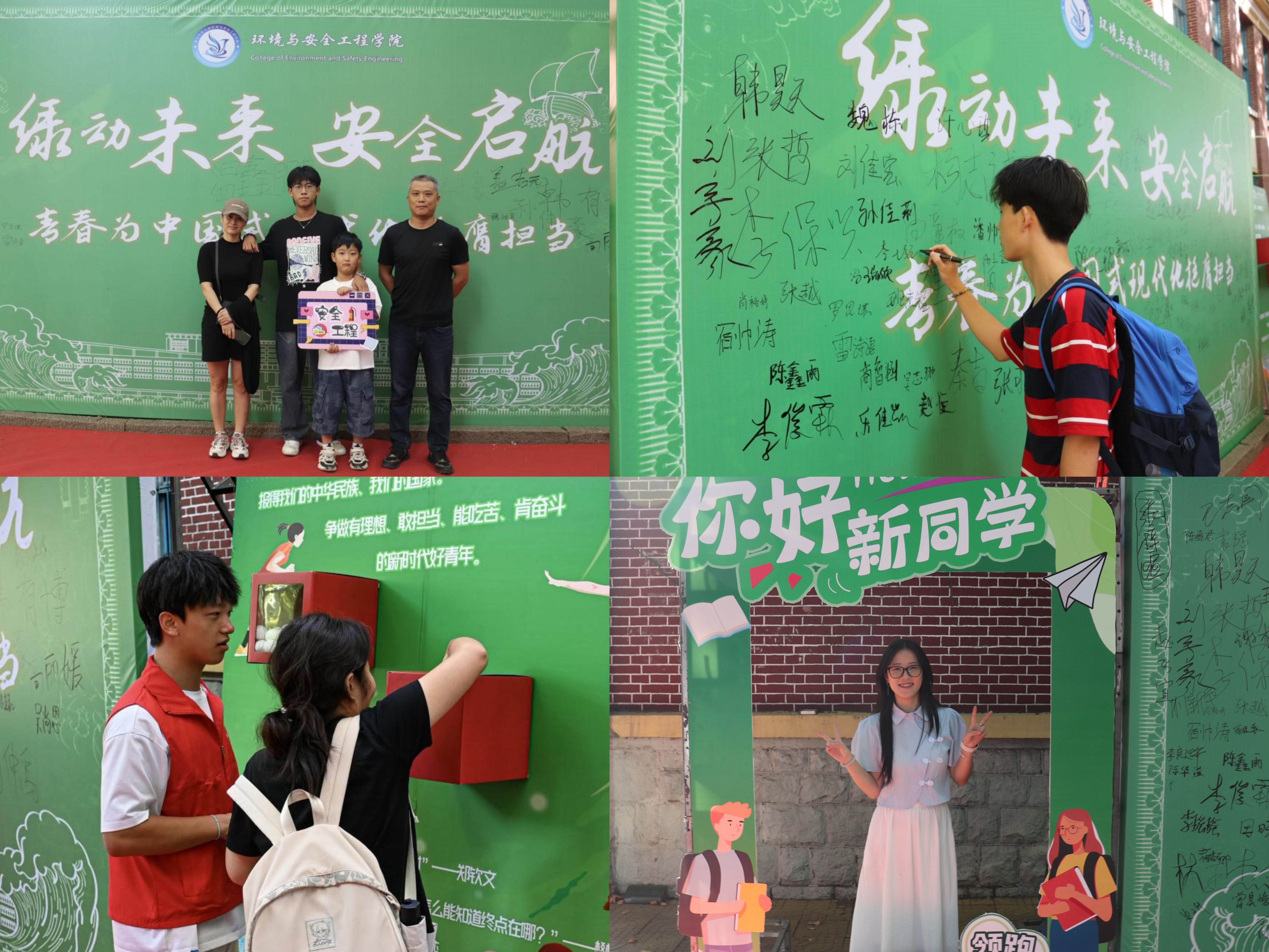 精心筹划,彰显学院特色。本次迎新以学院特色为主线,结合环境与安全两大学科优势,以专业特点为核心,以青春奋斗为基调,设置了“绿动未来,安全启航,青春为中国式现代化挺膺担当”为主题的绿色喷绘,新生在喷绘上签名和写下祝福,展现对未来生活的美好憧憬。“你好新同学”拍照框、迎新标语手举KT板等,吸引了众多新生驻足观看并拍照留念;融合奥运健儿励志语录与国乒元素创新设计运动展板,附置幸运抽奖盒,在互动中引导新生塑造奋力拼搏的体育精神和“爱体育·兴beat365”的校园文化,引领环境学院学子以饱满热情投入到新学期学习和生活中。