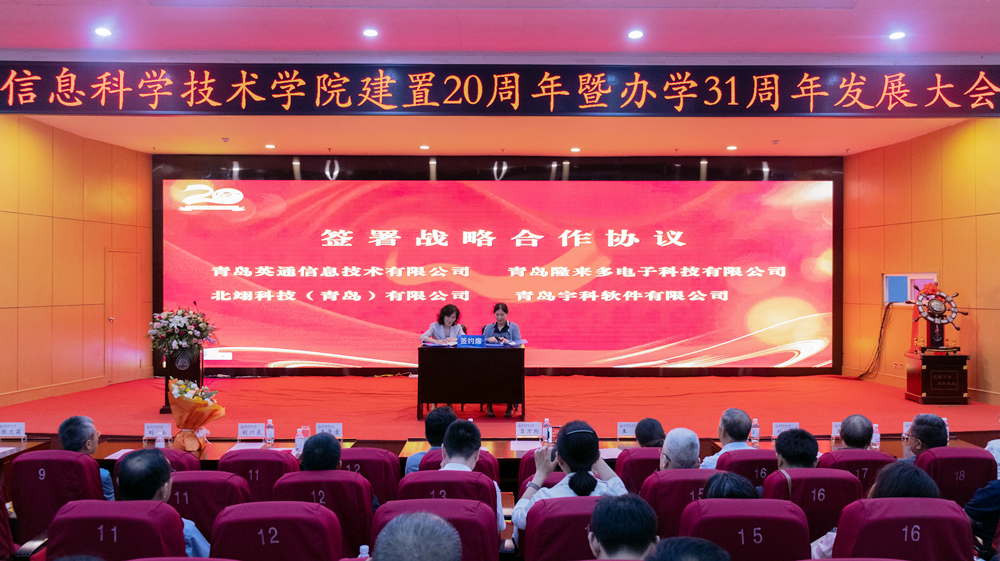 信息科学技术学院院长王景景向大会作了题为《凝心聚力谱新篇 踔厉奋发向未来》的发展报告,代表学院接受来自校友及企业的捐赠,与青岛英通信息技术有限公司、青岛隆来多电子科技有限公司、北翊科技(青岛)有限公司、青岛宇科软件有限公司分别签订共建行业学院战略合作协议。