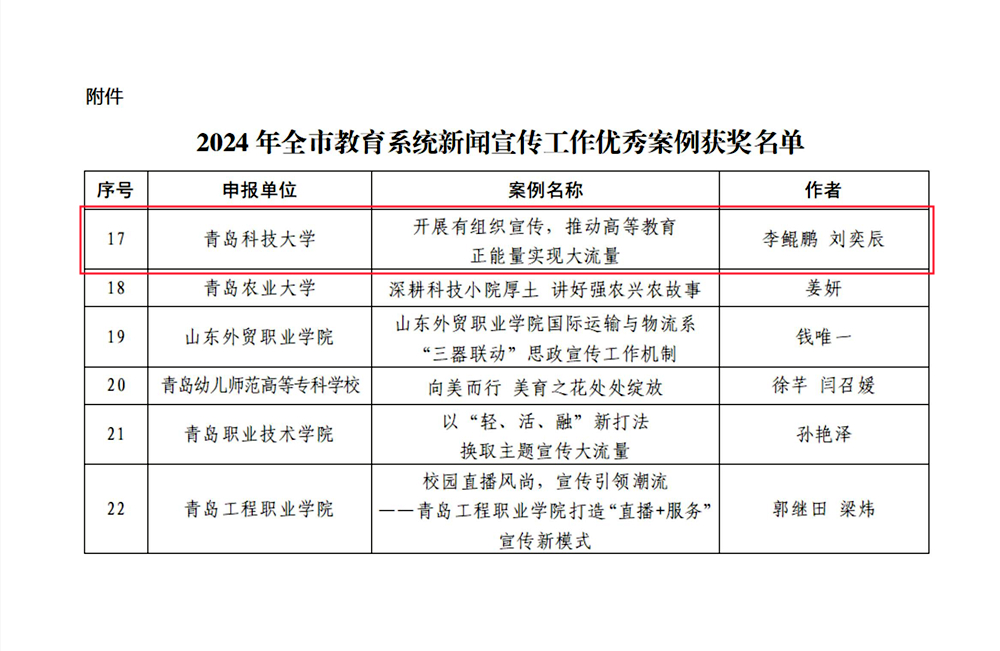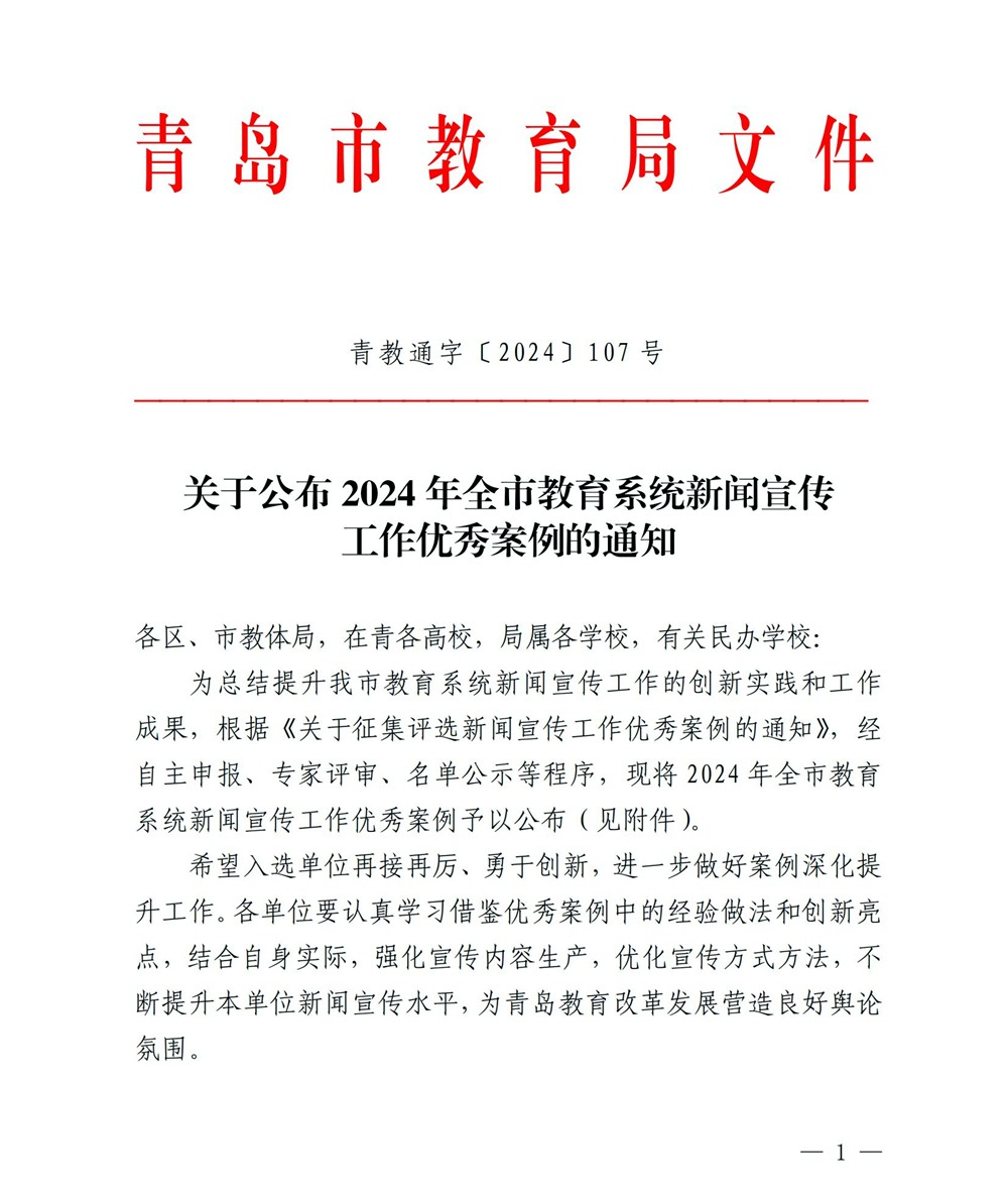日前,青岛市教育局发布了《关于公布2024年全市教育系统新闻宣传工作优秀案例的通知》,beat365正版唯一官网必一报送的案例《开展有组织宣传,推动高等教育正能量实现大流量》成功入选。