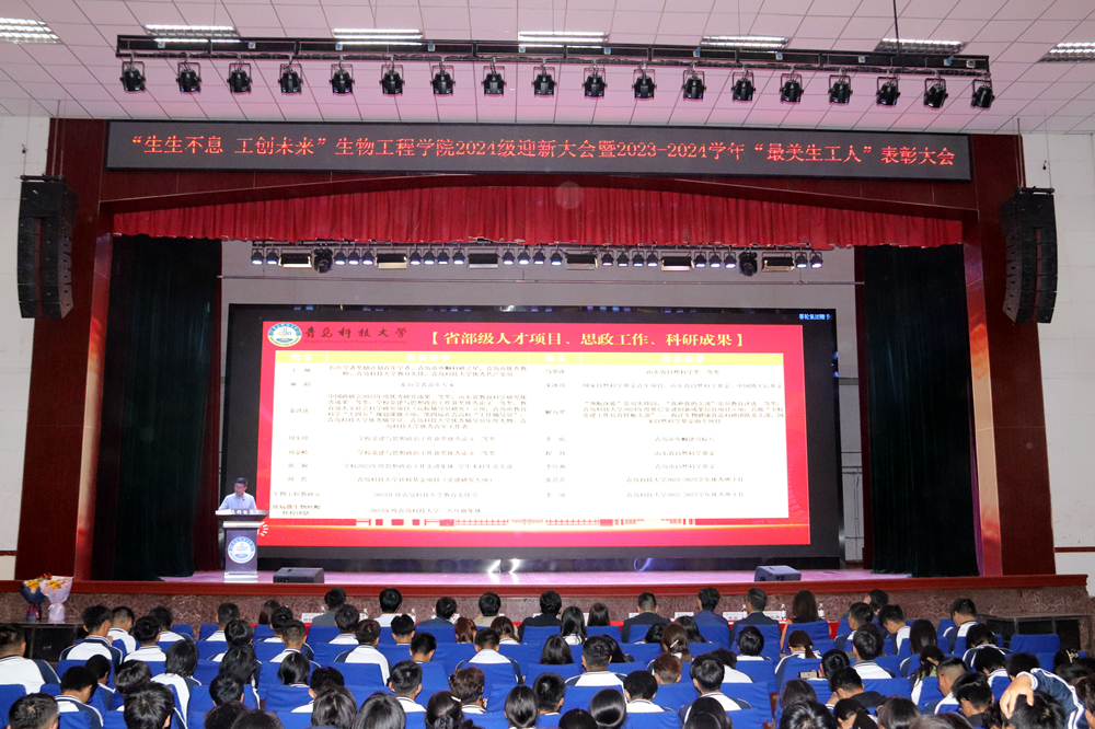 10月8日下午,生物工程学院2024级迎新大会暨2023-2024学年“最美生工人”表彰大会在四方校区西礼堂举行。学校教师工作部部长张洪坤、教务处处长马翠萍、离退休处处长王泽鹏、合作发展处(校友办)处长王帅以及研究生院、学生处、后勤处、校团委相关负责人,生物工程学院领导班子、校友代表、教师代表、2024级本科生研究生参加大会。