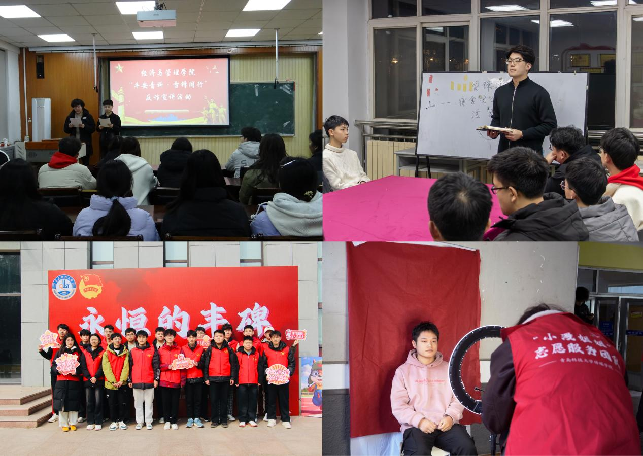 学思践悟深扎根,让雷锋精神在校园落地生花。校团委、校学生会、校研究生会开展“弘扬雷锋精神,践行青春担当”学雷锋主题教育实践活动,制定《学校共青团系统2025年度学雷锋活动方案》,举行“习近平总书记关于雷锋精神的重要指示精神专题学习会”,组织“旗展雷锋精神,弘扬道德新风”主题升旗活动、“挺膺担当展青年风采,传承精神扬雷锋风尚”雷锋精神分享会专项活动,推动学习雷锋精神常态化、长效化,形成人人学雷锋、处处见行动的良好氛围。数理学院团委承办“永恒的丰碑”雷锋精神专题展暨寒假社会实践成果展在崂山校区开幕,专题展以“理论阐释+实践叙事”为主线,创新打造沉浸式“六大展区”,作为新学期实践育人第一课,展览首日吸引400余名青年学生现场观展。艺术学院团委组织开展“光影悟雷锋,艺心永传承”观影、身边的“雷锋”故事分享会等活动,挖掘身边的好人好事,引导青年学生从日常小事践行雷锋精神。马克思主义学院团委以“践行‘两山’理论,守护校园绿水青山”为主题开展学雷锋校园实践活动,捡拾校园内登山步道区域的塑料瓶、食品袋、烟盒等各类不易降解的垃圾,守护了校园环境。数据科学学院团委通过“雷锋精神代代传,青春志愿谱新篇”主题团课生动讲解雷锋事迹和新时代雷锋精神,引导学生深刻理解雷锋精神的时代价值,也走进社区开展“践行雷锋精神,智启银龄生活”志愿服务活动,为老年人提供智能设备使用指导,帮助他们跨越“数字鸿沟”。化工学院团委以“传承雷锋精神,争做追‘锋’青年”为主题,开展互动问答、影像征集等活动,引导200余名学子感悟雷锋精神内核;创新“追锋行动”校园公益跑,将3.5公里运动实践与微志愿服务结合,绘就“运动+公益”青春图谱。自动化学院团委开展“践行雷锋精神,彰显青春担当”学雷锋主题团日活动与“AI家驿站”一站式学生社区志愿服务活动。材料学院团委开展“弘扬雷锋精神,争做时代新人”主题团日活动,通过主题宣讲和分享会,深入学习雷锋事迹,引导青年学生树立奉献意识,争做新时代有为青年。化学院团委组织开展“学雷锋”主题班会、团日活动,通过介绍雷锋生平事迹、诵读雷锋日记名言,激励同学们将个人追求与国家发展相连,以实际行动传承弘扬雷锋精神,构建优良班风、和谐校园。经管学院团委开展“读《雷锋日记》,谈人生理想”雷锋精神读书分享会,引导学生深化对雷锋精神的理解与认识,深刻把握雷锋精神的时代内涵,同时通过“平安青科·雷锋同行”反诈宣讲活动,帮助学生培养反诈意识,增强自我保护能力。高密校区团委举办“光影绘雷锋,创意传真情”雷锋月主题系列活动,运用手绘、电脑设计等多样形式,大胆创新,设计出风格多样的海报,展现了雷锋精神在新时代的传承与创新。