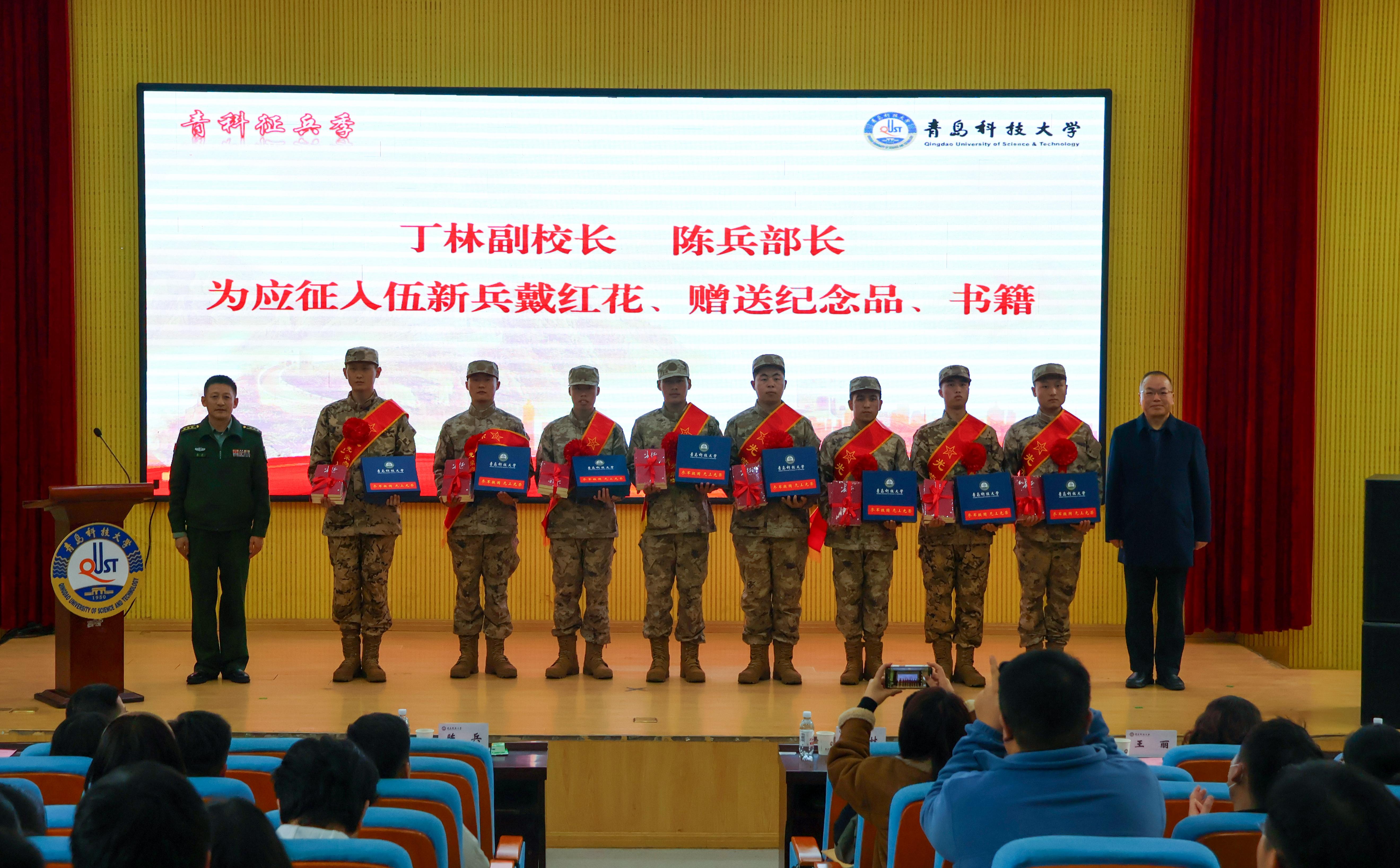 陈兵为学校颁发青岛市“2024年度征兵工作先进单位”奖牌。党委学生工作部部长兼武装部部长王丽为学校2024年度“征兵工作先进集体”、“征兵工作先进个人”颁发了奖牌和证书。党委宣传部、校团委、后勤处相关负责人分别为应征入伍毕业生颁发了“国防奖学金”奖金牌,为“荣军驿站”窗口颁发了牌匾。2024年度“征兵工作先进个人”代表巩金梦作了征兵宣讲,退役大学生士兵代表、入伍新兵代表分别作了发言。