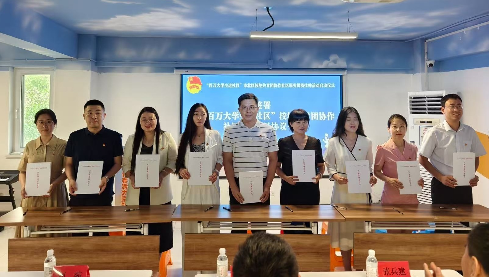 仪式上,市北区团委介绍了“百万大学生进社区”校地共青团协作社区服务揭榜挂帅项目情况,学校团委交流了学校大学生社区实践工作开展情况。校团委书记刘跃宁和市北区团委书记刘莎共同为“大学生社会实践基地”揭牌。市北区委社会工作部张兵建为beat365正版唯一官网必一志愿服务队授予“社区服务先锋队”旗帜。7个街道与学校项目服务队签署协议书。
