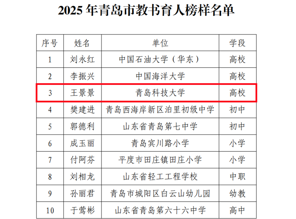近日,青岛市委宣传部、市教育局开展了青岛市教书育人榜样选树宣传活动,评选出10名青岛市教书育人榜样。学校信息科学技术学院教授王景景获评该项荣誉。