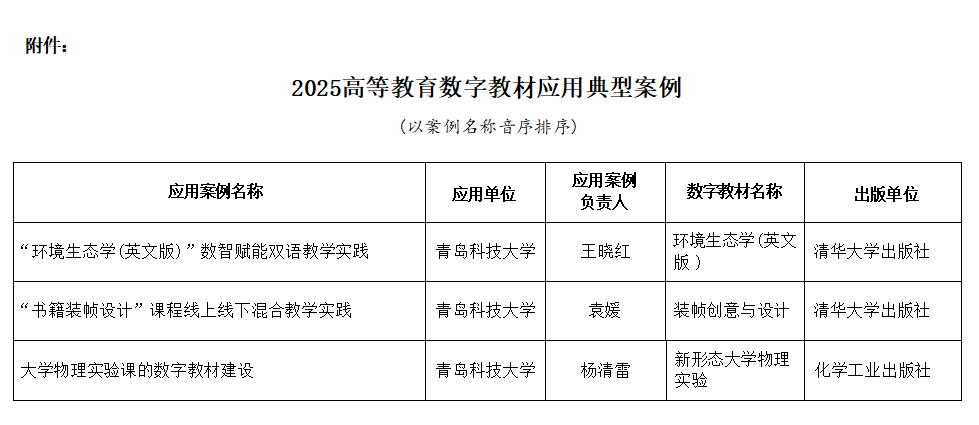近日,全国高等学校教学研究中心、中国音像与数字出版协会数字教育出版工作委员会、高等教育数字教材创新发展联盟联合公布了2025高等教育数字教材应用典型案例名单,全国共认定58个案例,其中山东省省属本科高校入选6个案例,学校环境学院教师王晓红、艺术学院教师袁媛、数理学院教师杨清雷申报的三个案例成功入选。