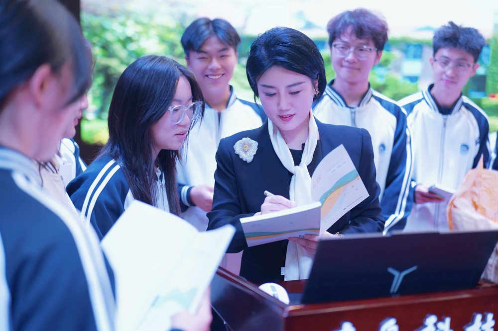 报告会后,朱珊珊为与会学生代表签名赠书。