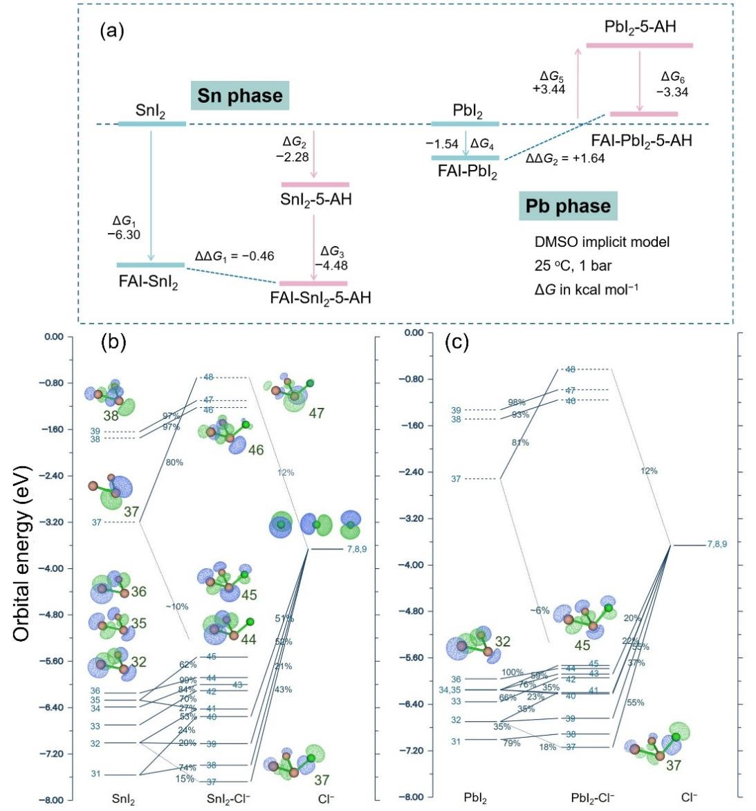 周忠敏团队分析了钙钛矿前驱体溶液中竞争反应的吉布斯自由能以及分子轨道相互作用,揭示了选择性配位机制,通过引入分子5-AH,选择性地与SnI2配位,形成热力学上有利的SnI2-5-AH加合物,从而延迟了Sn基钙钛矿的结晶。这种结晶调节提高了成分均匀性和结晶质量,从而有效地抑制了非辐射复合。此外,Sn2+5-AH之间的强相互作用以及更少的晶界抑制了Sn2+的氧化。钙钛矿的结晶在注入反溶剂后开始。因此,在环境条件下研究钙钛矿前驱体溶液中溶质之间的相互作用过程是必要的。在图1中,对于左侧所示的“Sn,在FAISnI2一步生成FAI-SnI2FASnI3的单元)的过程中释放出相当大的吉布斯自由能(ΔG1)。当引入5-AH分子时,可以先形成SnI2-5-AH加合物(ΔG2),然后再与FAIΔG3)结合。与原始的FASnI3形成(ΔΔG1<0)过程相比,这个过程在热力学上更有利,并且稳定了Sn基钙钛矿组分,从而降低了缺陷密度和对氧的亲和力。此外,较温和的相互作用(|ΔG3| < |ΔG1|)有助于延缓和调节结晶。相反,在“Pb中,与ΔG1相比,FAI-PbI2的形成仅导致微小的吉布斯自由能下降(ΔG4),这表明Sn基钙钛矿的结晶往往比Pb基的结晶发生得更快。通过计算还发现,加合物PbI2-5-AHDMSO连续介质中是不利的(ΔG5)。虽然PbI2-5-AHFAI之间的结合在理论上也是自发的(ΔG6),但是该复合物不能稳定FAPbI3组分(ΔΔG2 > 0)。因此,5-AHSn-Pb合金前驱体溶液中显示出对SnI2的热力学选择性,并减少了SnPb物种结晶速率的失配。
