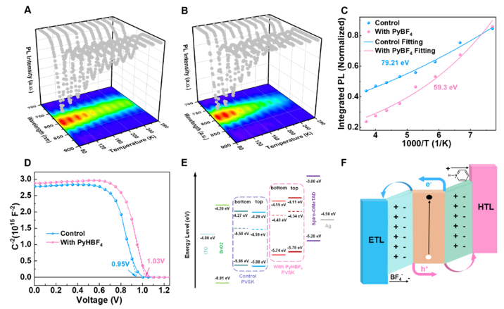 钙钛矿太阳能电池的界面工程是提升器件性能的关键策略之一,其中界面偶极层的构建能够有效调控能级排列并减少非辐射复合。然而,现有研究通常仅针对单一界面(如钙钛矿/电子传输层或钙钛矿/空穴传输层界面)进行修饰,且多采用复杂的多组分处理体系。目前,尚未有研究报道通过单一化合物后处理在n-i-p型器件中同时实现钙钛矿/ETL和钙钛矿/HTL界面双偶极层构建的案例。这一技术空白限制了界面协同优化的潜力,也增加了工艺复杂性。针对这一问题,周忠敏教授团队采用离子液体四氟硼酸吡啶鎓(PyHBF4)作为多功能界面修饰剂,通过其阴离子(BF4)与钙钛矿骨架的动态离子交换作用,在钙钛矿体系中实现了贯穿体相至双界面的偶极层定向构筑。通过揭示PyH+I的选择性结合机制及BF4沿Pb-I框架的迁移路径,阐明了双偶极层的自形成动力学。这种与内置电势方向一致的偶极层设计,结合π-π堆积效应和缺陷钝化作用,为同步提升器件的光伏性能和环境稳定性提供了新思路。