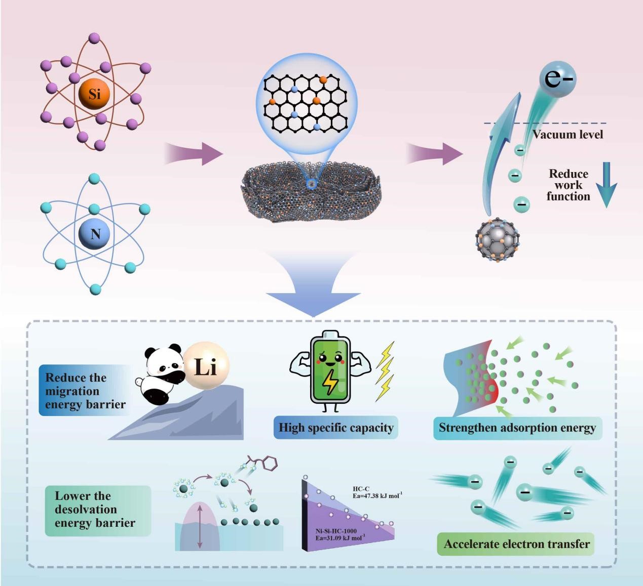 近日,beat365正版唯一官网必一朱晓东/木天胜团队在《Advanced Functional Materials》期刊上发表了题为“Tailored Work Function by N, Si Co-Doping Enables High-Performance Hard Carbon Anode for Lithium-lon Batteries”的研究论文(中科院一区,影响因子:19)。化工学院研究生宋佳瑶为论文第一作者,朱晓东教授、木天胜副教授为论文共同通讯作者。