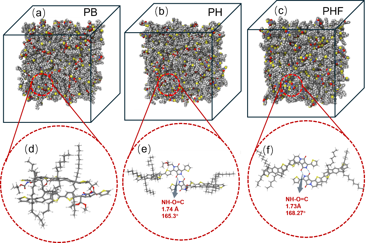 该工作采用了分子动力学模拟进一步了解聚合物在宏观环境中的包装和排列情况。如图4所示,在宏观尺度上,所有聚合物均呈现无定形状态。局部放大图显示,由于长烷基链和Boc基团的存在,P-B聚合物体系在分子排列上表现出明显的无序性。相比之下,在H-B类型的聚合物P-H和P-HF中,我们观察到了由氢键(NH-C=O)诱导的局部有序排列行为。P-HF的氢键能力略强于P-H,这一结果证明了环融合协同作用能增强材料的局部有序排列能力。