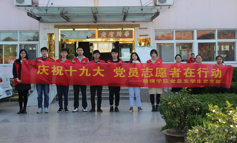 数理学院党总支邀请学校马克思主义理论研究中心主任杜裕禄为师生作党的十九大精神宣讲报告。学院教工党员开展“课堂三分钟,宣讲十九大精神”活动,利用上公共课的时间为学生宣讲十九大精神;学生党员开展“喜迎十九大,不忘初心跟党走”系列活动。各班召开“喜迎十九大、展望新未来”主题班会或知识竞赛;学生党员及入党积极分子到青岛莲花老年公寓开展“喜迎十九大、党员志愿者在行动”志愿服务活动。