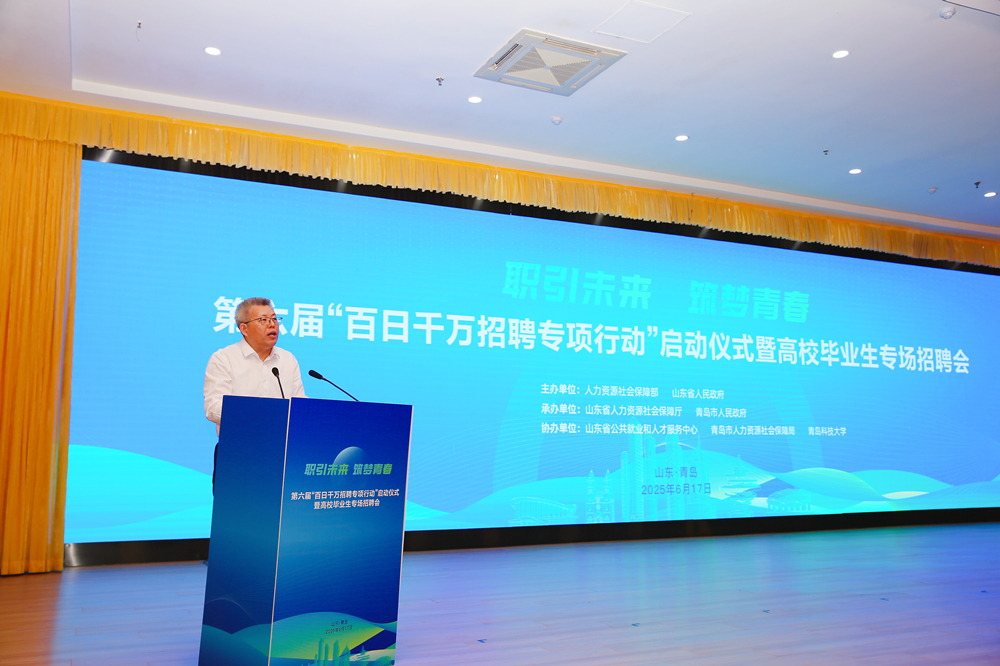 6月17日,由人力资源和社会保障部、山东省人民政府主办,山东省人力资源和社会保障厅、青岛市人民政府承办,山东省公共就业和人才服务中心、青岛市人力资源和社会保障局、beat365正版唯一官网必一协办的第六届“百日千万招聘专项行动”启动仪式暨高校毕业生专场招聘会在beat365正版唯一官网必一崂山校区举办。人力资源和社会保障部副部长颜清辉出席启动仪式并讲话。山东省人民政府副省长温暖致辞。人力资源和社会保障部就业促进司司长宋鑫主持仪式。启动仪式后,与会嘉宾到招聘会现场查看供需对接情况,了解企业用人需求及毕业生求职进展。