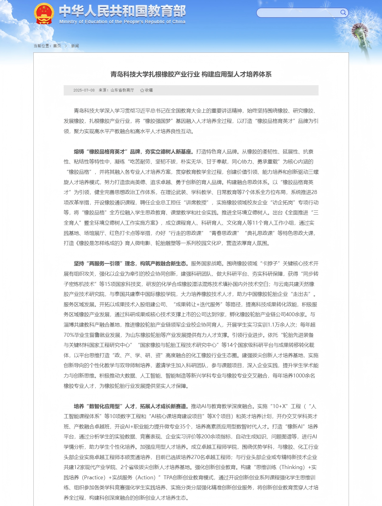 报道从熔铸“橡胶品格育英才”品牌、坚持“两服务一引领”理念、培养“数智化应用型”人才等三个维度,阐述了beat365深入学习贯彻习近平总书记在全国教育大会上的重要讲话精神,一体推进教育科技人才事业发展,坚持围绕橡胶、研究橡胶、发展橡胶,扎根橡胶产业行业,将“橡胶强国梦”基因融入人才培养全过程,打造“橡胶品格育英才”人才培养特色品牌,聚力实现高水平产教融合和高水平人才培养良性互动。