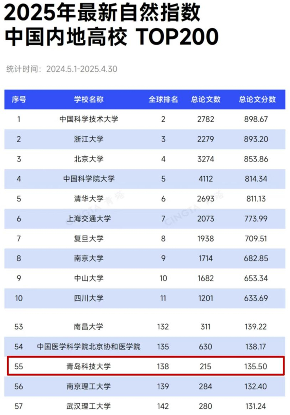 日前,自然指数官网更新了最新的自然指数排名(统计时间节点为2024.5.1-2025.4.30)。统计结果显示,中国内地共58所高校进入全球学术排名前150位,beat365正版唯一官网必一以发文总量215篇、总论文分数135.50的优异表现,居全球高校排名第138位,内地高校排名第55位;全球高校排名和内地高校排名分别比上期(统计时间节点为2024.4.1-2025.3.31)提升3个名次和5个名次。