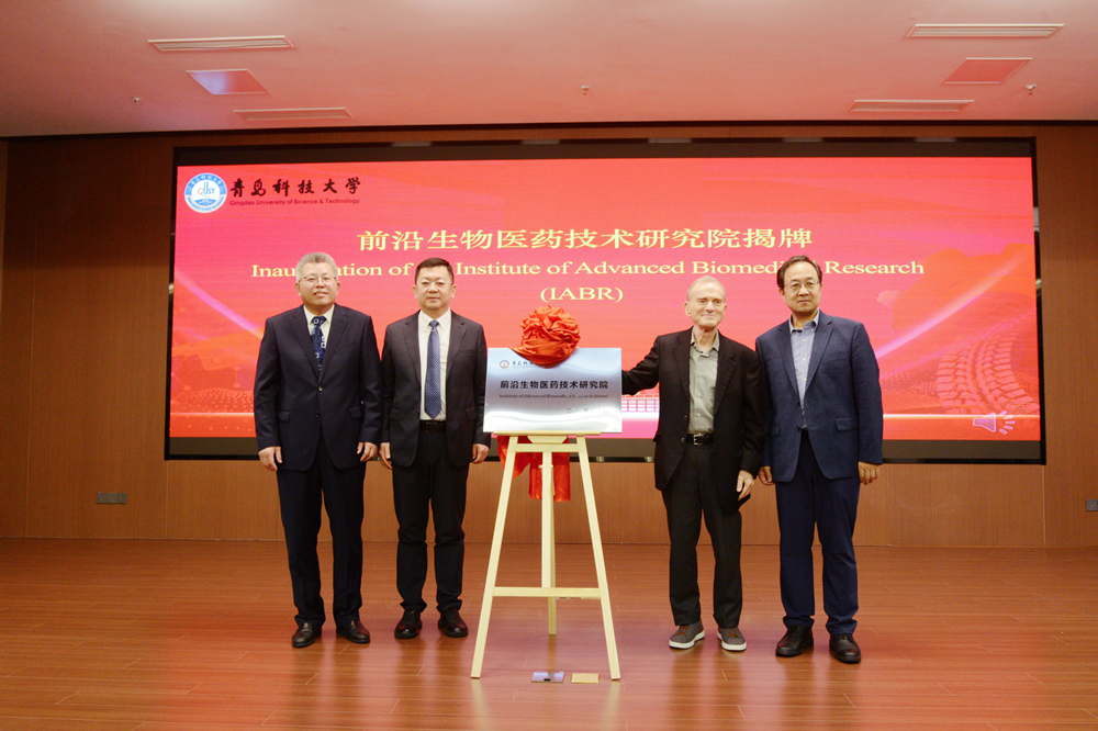 仪式上,Randy W.Schekman、杨天梅、韩利军、前沿生物医药技术研究院院长窦效伟共同为研究院揭牌。