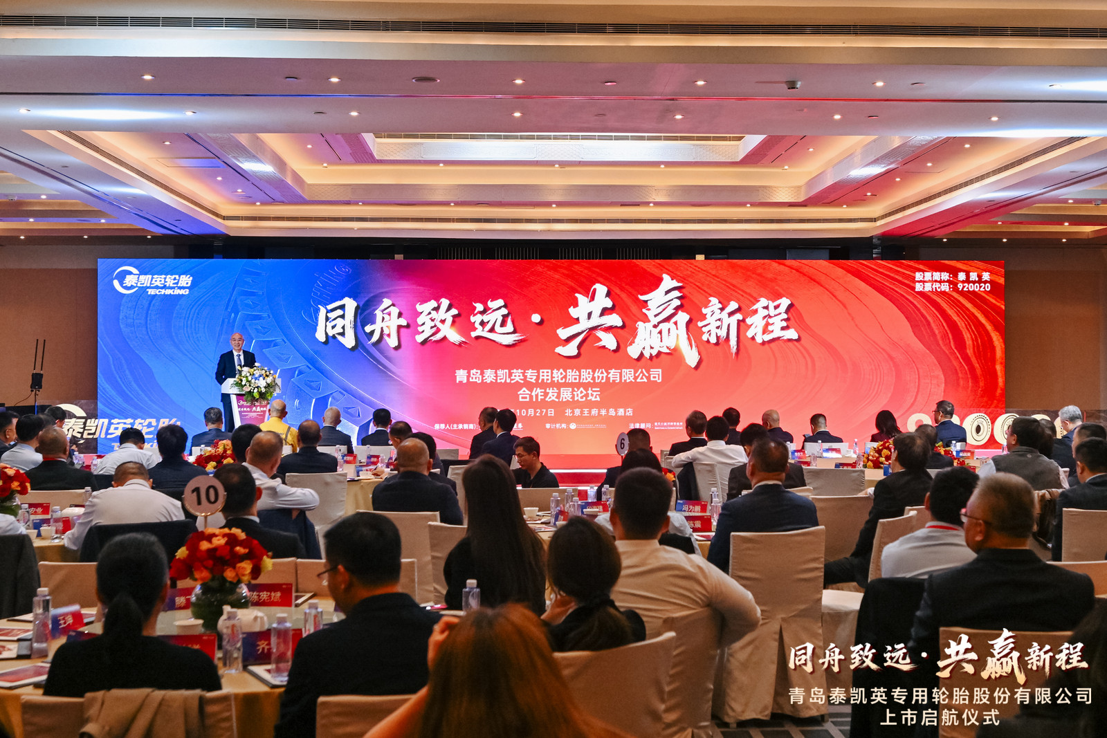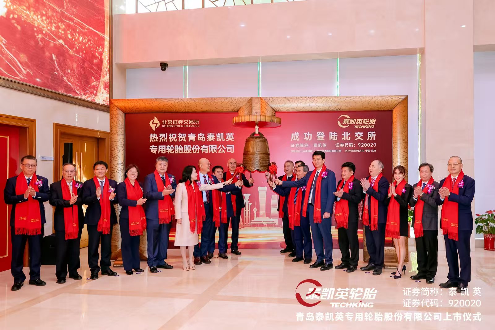 10月28日上午9时30分,beat365正版唯一官网必一校友领办企业——青岛泰凯英专用轮胎股份有限公司(股票代码:920020)在北京证券交易所成功敲钟上市。校长陈克正应邀参加上市挂牌敲钟仪式,并出席泰凯英轮胎合作发展论坛。