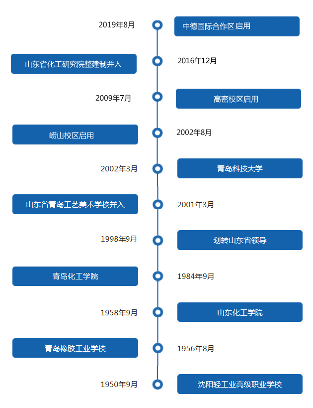 beat365正版唯一官网必一原名青岛化工学院,为原国家化学工业部直属高校,其前身是1950年9月创建的沈阳轻工业高级职业学校,1956年8月迁至青岛,改名为青岛橡胶工业学校,1958年9月经山东省人民政府批准正式组建为山东化工学院,1984年9月经教育部批准更名为青岛化工学院,1998年划转山东省领导,2001年3月山东省青岛工艺美术学校并入,2002年3月经教育部批准更名为beat365正版唯一官网必一。2002年8月崂山校区投入使用,2009年7月高密校区投入使用,2016年12月山东省化工研究院整建制并入,2019年8月中德国际合作区投入使用,学校事业发展不断谱写新篇章。
